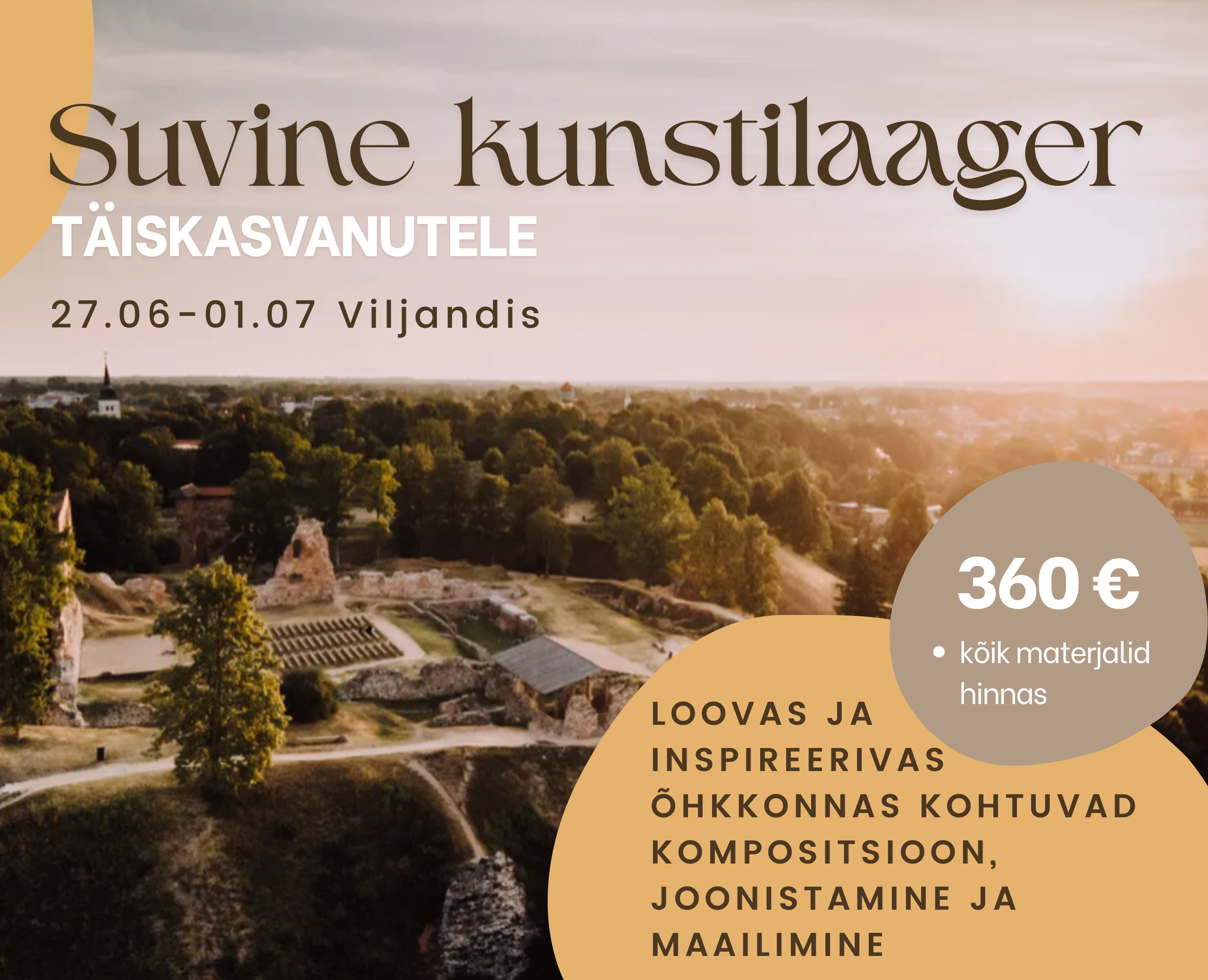Laager kestab 27. juunist 01. juulini ja on mõeldud täiskasvanutele. Laagris proovime kätt visandlikus ja realistlikus joonistamises ning pastell- ja akrüülmaalis. Rõhuasetus on sellel kursusel kompositsioonil. Õpime tundma nippe, kuidas luua pildi asemel maal. Kunstivooludest teeme põgusalt tutvust naivismi ja romantismiga. Igal osalejal valmib ka Viljandi hõnguline mood board ning värvipalett. Õppekava on leitav meie Facebooki lehel.
